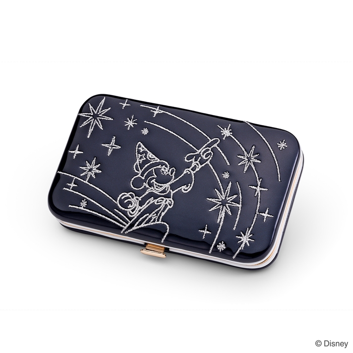 パール感のあるダークネイビーにシルバーの刺繍を施した、クールな印象のトラベルジュエリーケース。魔法使いの弟子に扮したミッキーマウスが夜空の星たちを指揮するシーンを描いた、ケイウノオリジナルデザインです。ケースの中身はスエード調のやわらかな布地を使用。高級感のあるダークネイビーにジュエリーがよく映えます。ネックレス・リング・ピアスなどが収納できます。手のひらにおさまるミニサイズ。年代を問わず使いやすい落ち着いた色味です。専用ケース入りなので贈り物にも。