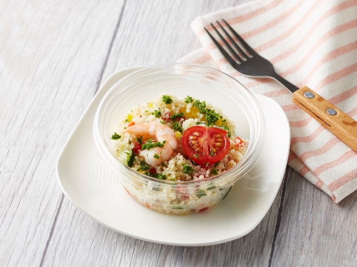 オリーブオイルや柑橘ハーブソース、マリネドレッシングをベースに、クスクスや赤黄パプリカ、きゅうり、玉葱を混ぜ合わせ、ミニトマトと海老をトッピングしました。