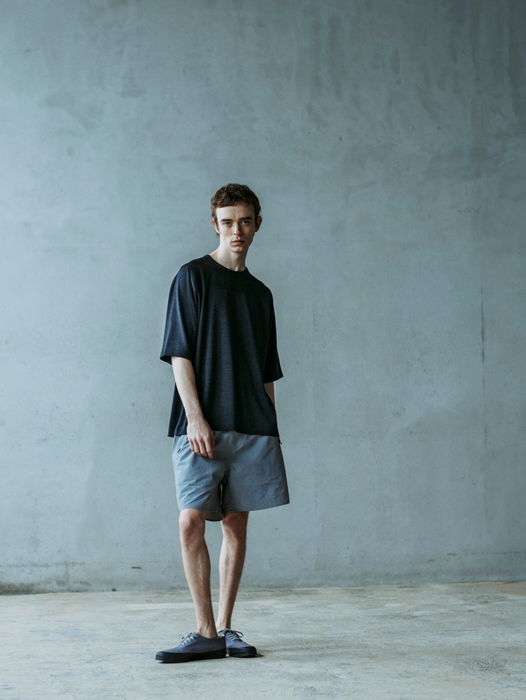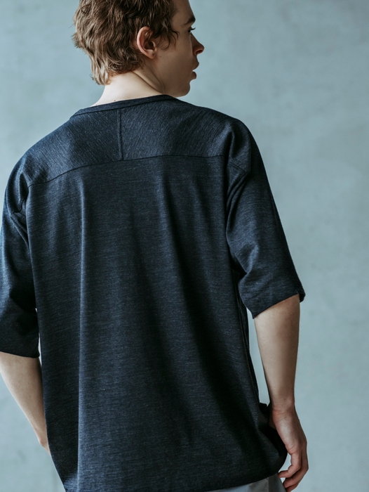 この生地を使って、古着のフットボールTシャツの形をベースに別注しました。古着には存在しないウール100%のフットボールTシャツは、身幅もボックスシルエットに仕上げる事で軽やかに着用する事が可能になりました。