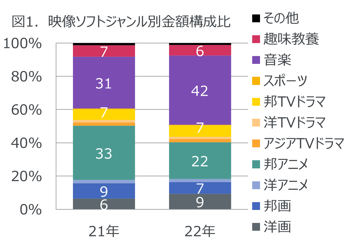 ジャンル別の金額構成比では、「Snow man」や「なにわ男子」等のライブ作品で盛り上がった音楽が前年から11%ポイント伸長し、42%となった(図1)。その一方で、前年「劇場版鬼滅の刃」が注目を集めた邦アニメは11%ポイント縮小した。そのほか、36年ぶりの続編が大ヒットした「トップガンマーヴェリック」等の洋画が構成比を3%ポイント拡大させた。