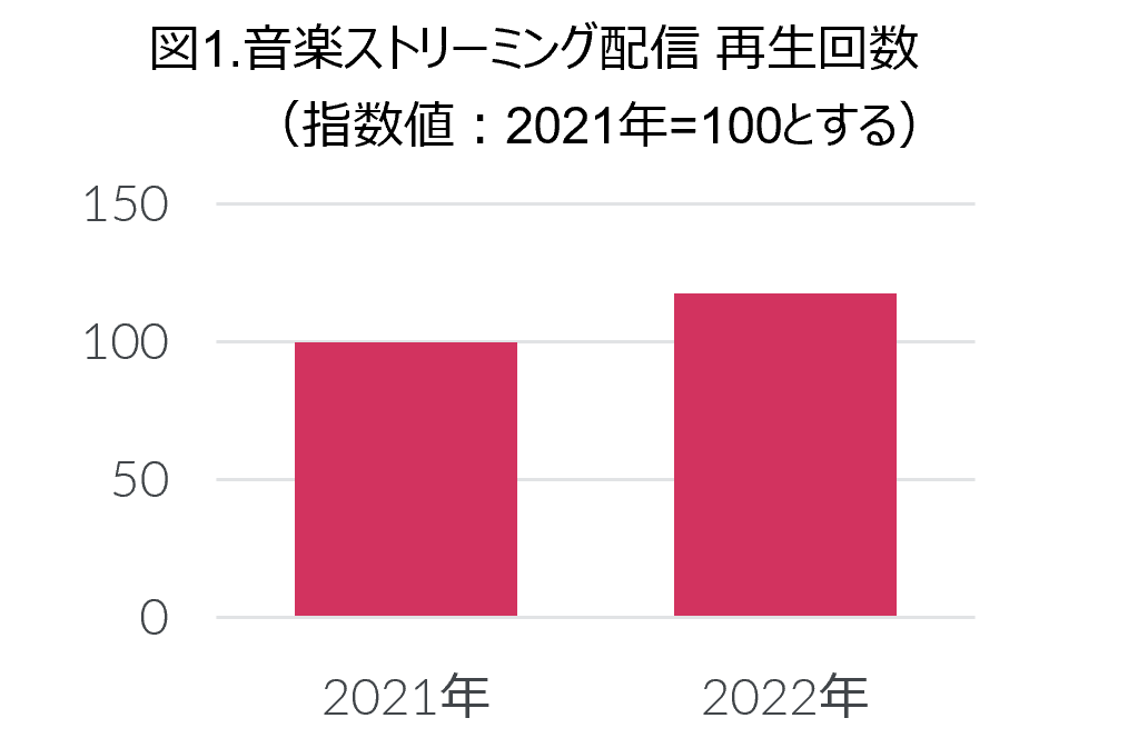 音楽ストリーミング配信市場は、伸長率が下がっているものの2022年の再生回数は前年の18%伸長となり、ストリーミング利用は堅調に増加傾向となった(図1)。