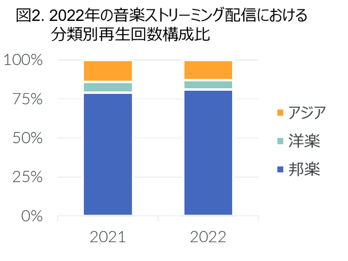 邦楽・洋楽・K-POPを含むアジアの分類別に動向*3をみると、邦楽は前年と比較して2%上昇し大きなシェアを占めた。洋楽とアジアのシェアは前年比で共に1%縮小傾向だった。再回数構成比では前年同様に邦楽が8割超、洋楽が1割弱、アジアは1割強を占めた(図2)。
