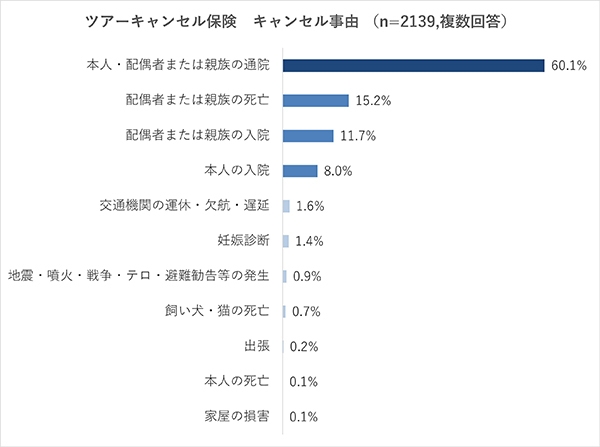 「本人・配偶者または親族の通院」が60.1%と最多です。そして「配偶者または親族の死亡」が15.2%、「配偶者または親族の入院」が11.7%、「本人の入院」が8.0%と続きます。本人が旅行に行ける状態であっても、配偶者や親族など身の回りの方の事由によってやむなく旅行をお取消ししている人も非常に多いことが分かります。