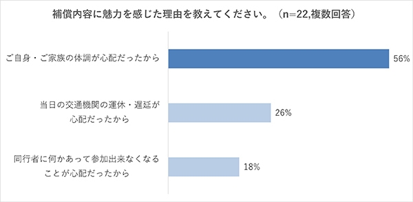 補償内容に魅力を感じた理由として「ご自身・ご家族の体調が心配だったから」を選んだ人が最も多く、56%となっています。次いで、26%の人が「当日の交通機関の運休・遅延が心配だったから」と答えており、18%の人が「同行者に何かあって参加出来なくなることが心配だったから」を選んでいます。