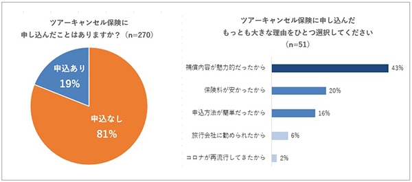 ツアーキャンセル保険を認知しているお客様のうち、実際に申し込んだことがある旅行者は19%で、約2割の人に申し込みの経験があることがわかります。