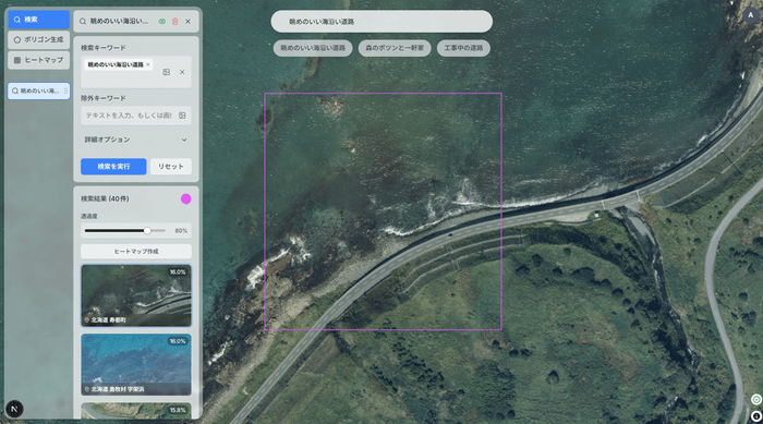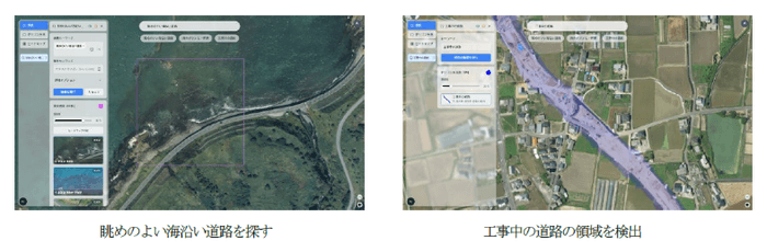 「閑静な住宅街」や「眺めのよいドライブコース」などのあいまいな言葉や画像から、衛星画像データ内の目的の場所や状況を瞬時に発見します。