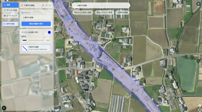 マルチモーダルAIが衛星画像を解析し、「太陽光パネル」や「工事中の道路」など、指定した意味合いを持つ領域を検出して高精度な地図情報(構造化データ)を生成します。