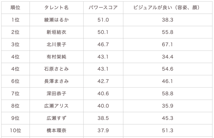 パワースコアが高い女優=ビジュアルスコアも高いのかということをタレントパワーランキングを用いて検証。