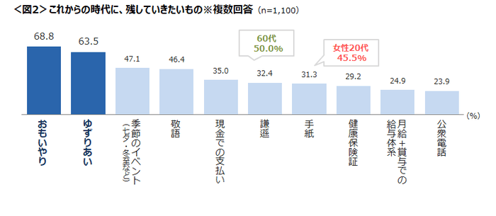 これからの時代にも残していきたいものは「おもいやり」「ゆずりあい」が2トップ。