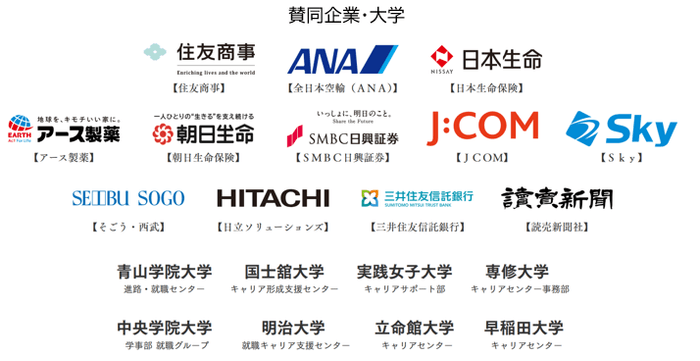 【大学】青山学院大学(進路・就職センター)/国士舘大学(キャリア形成支援センター)/実践女子大学(キャリアサポート部)/専修大学(キャリアセンター事務部)/中央学院大学(学事部就職グループ)/明治大学(就職キャリア支援センター)/立命館大学(キャリアセンター)/早稲田大学(キャリアセンター)
