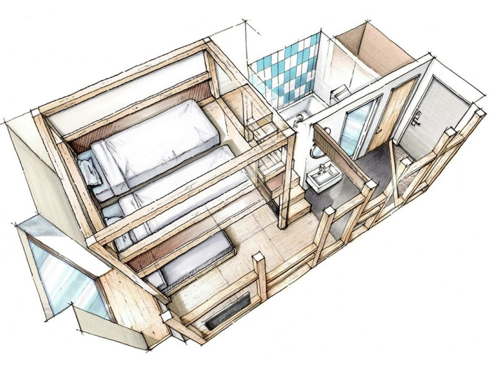 OMO5東京大塚のYAGURA Roomは、ちいさいけれどめちゃ楽しいコンセプトルーム。やぐら階下の大きなくつろぎソファで、リビングのように寛ぎながら居酒屋気分を楽しめます。また、「夜通し飲むぞ!」と思っていたものの残念ながら早く脱落した方は、やぐら階上のベッドに潜り込んで早めの「おやすみなさい」も叶います。