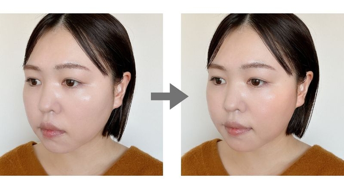 頬に乗せたチークをそのままフェイスラインとあごにもオン。下顔面がきゅっと引き締まった印象になり、小顔効果が狙えます。