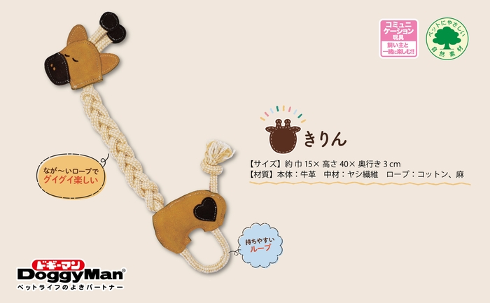 夢中でカミカミしちゃう牛革と編み込みロープを使用した、かわいいうさぎときりんの形のおもちゃ。ループ&なが~いロープでぐいぐいひっぱりっこあそび!・編み込みロープを噛むことで、遊びながら歯垢も除去・「持っておいで」のトレーニングにも・中材にヤシ繊維を使用・超小型・小型犬対象。