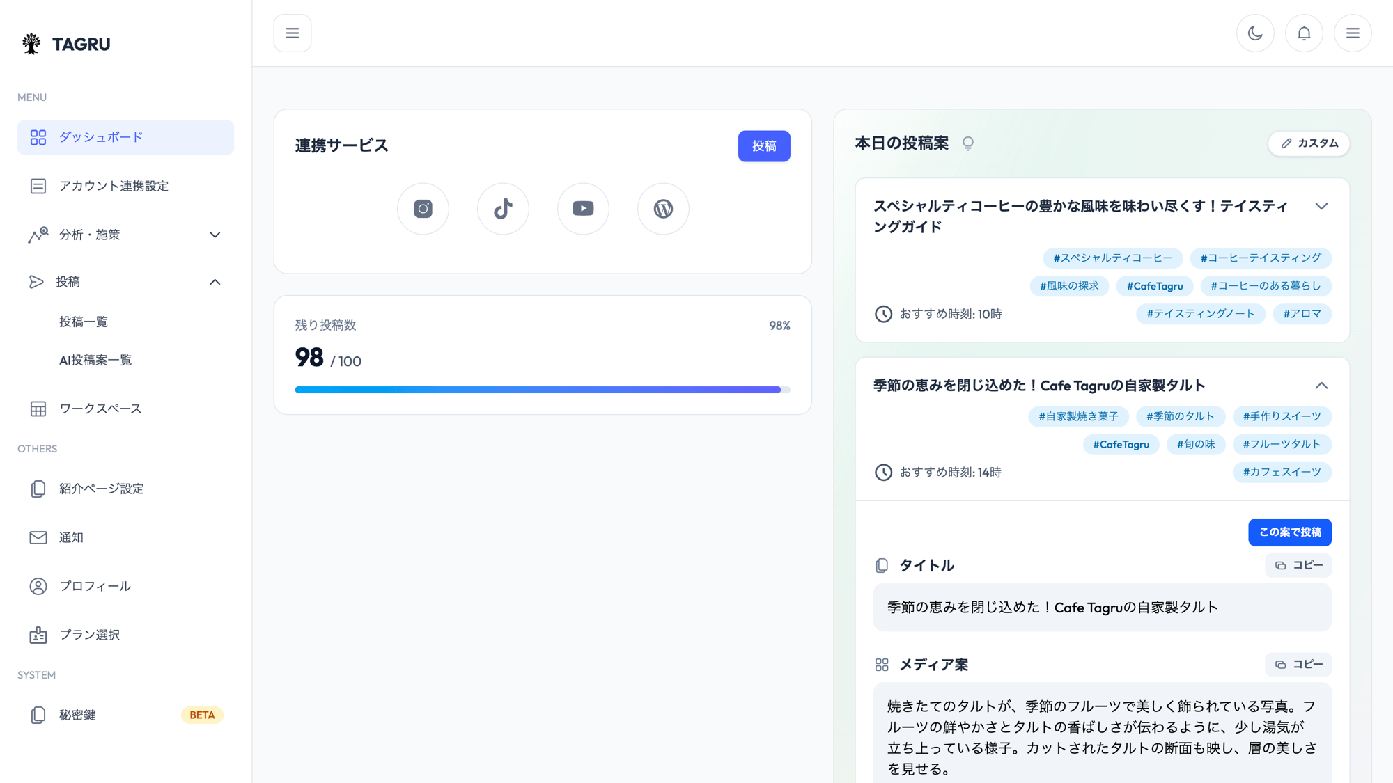 2025年12月、忙しい個人事業主や中小企業オーナー向けに、SNS運用をAIがトータルサポートするサービス「TAGRU(タグル)」を正式リリースしました。