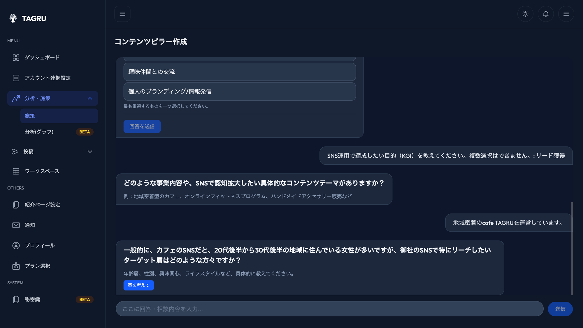 AIによる約10分のヒアリングを行い、SNS運営の目的を決定します。