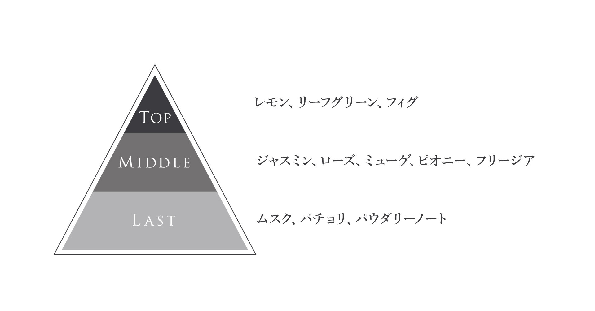ミドルノート:ジャスミン、ローズ、ミューゲ、ピオニー、フリージア