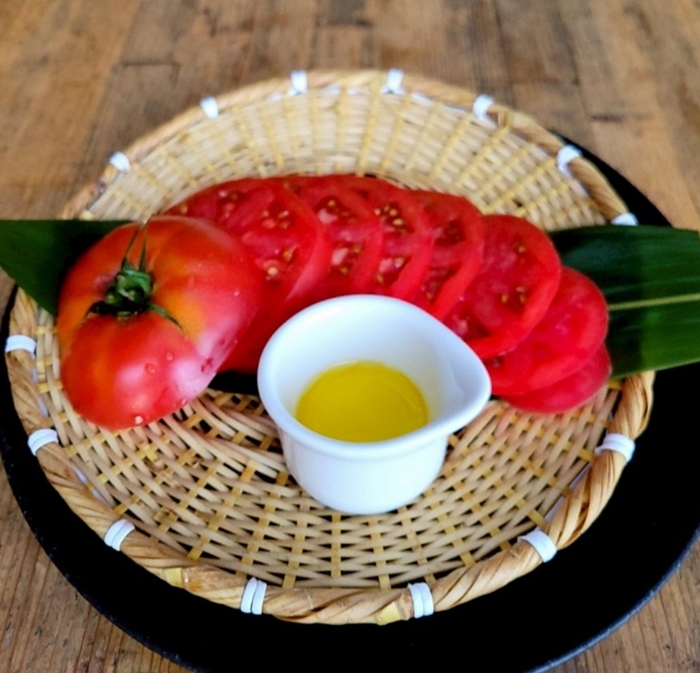 ●甘くて、果肉たっぷりジューシーな山口さんちのトマトをオリーブオイル・塩で美味しくいただけます。
