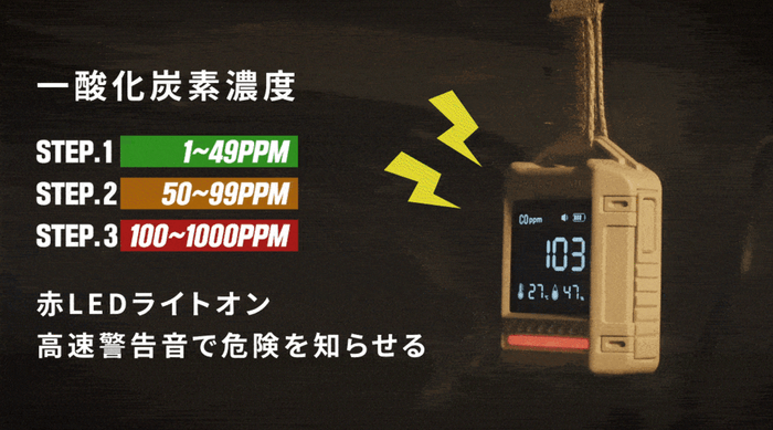 独自の高精度センサーによって、0~1000ppmの一酸化炭素濃度をリアルタイムに正確に検知します。キャンプやテント内の密閉された空間では特に危険度が増す無色無臭で気づきにくい一酸化炭素。「50ppmを超えたら換気をする習慣をつける」というのが大事です。