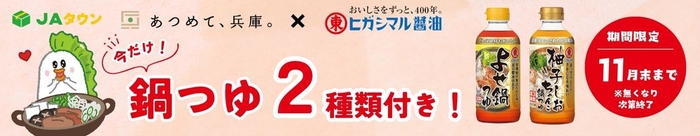 【JAタウン「あつめて、兵庫。」×ヒガシマル醤油】 今だけ、お客様送料負担なし!さらに、ヒガシマル醤油「鍋つゆ」2本付きの 冬にピッタリ「はくさい鍋野菜セット」の予約販売開始。