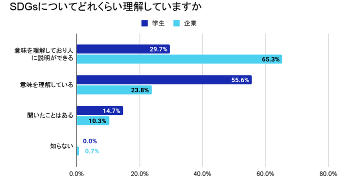 SDGsの理解度に関する設問における、最多の回答は企業が「意味を理解しており人に説明ができる」65.3%、学生が「意味を理解している」55.6%という結果でした。学生より企業の担当者の方がSDGsの理解度が高いことがわかりました。