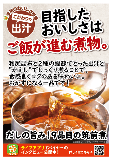 「かつお節」は力強い旨味が特徴の”血合いあり”と、澄んだ上品な香りが特徴の”血合いなし”をブレンド。旨味が強くクセの少ない「北海道産利尻昆布」と共に元和食料理人監修のもと基本に忠実に丁寧に煮出し、かつお節と昆布の旨みが合わさった自慢のライフオリジナルだしが完成しました。