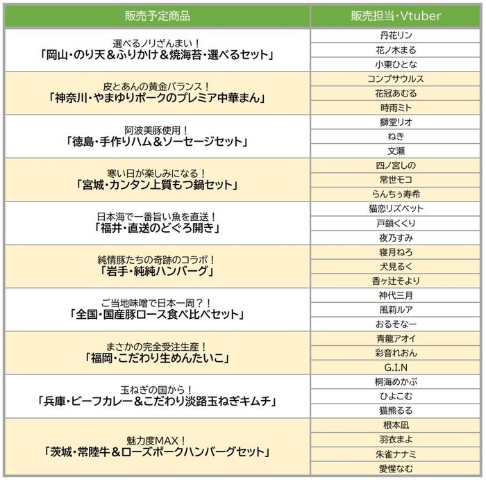 販売する商品は、JAタウンの商品の中からお肉や各地の特産物などこだわりの10商品を選定。人気Vtuberの根本凪さんをはじめとした総勢31名のVtuberが売り子となって販売会を行います。