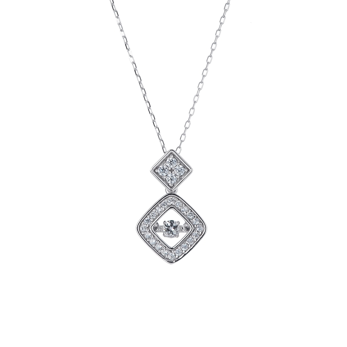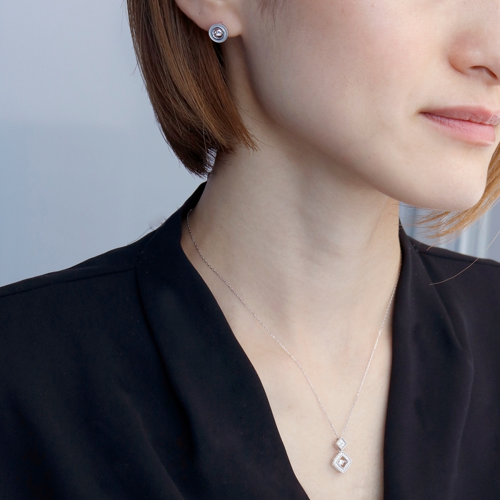 ネックレスは、少し辛口のクッションタイプのひし形で、バチカン部分にもメレ石を使うことでシックでありゴージャスな印象のデザインにし、