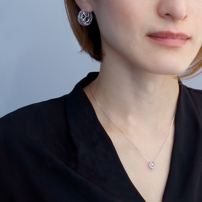 ピアスは艶感の出る仕上げと、上部にはそれぞれサイズの異なるメレ石を配置することでクールな中に華やかな輝きが印象に残るデザインに仕上げました。