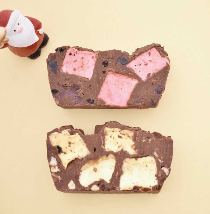 2つ目は「塩キャラメルパッションロッキーロード」(写真下)。塩キャラメルミルクチョコレートの中に、塩パインとパッションフルーツのマシュマロを入れ込んだ、様々な味わいを楽しめるロッキーロードです。キャラメルビスケットやカカオニブも入っているので、食感も存分にお楽しみいただけます。