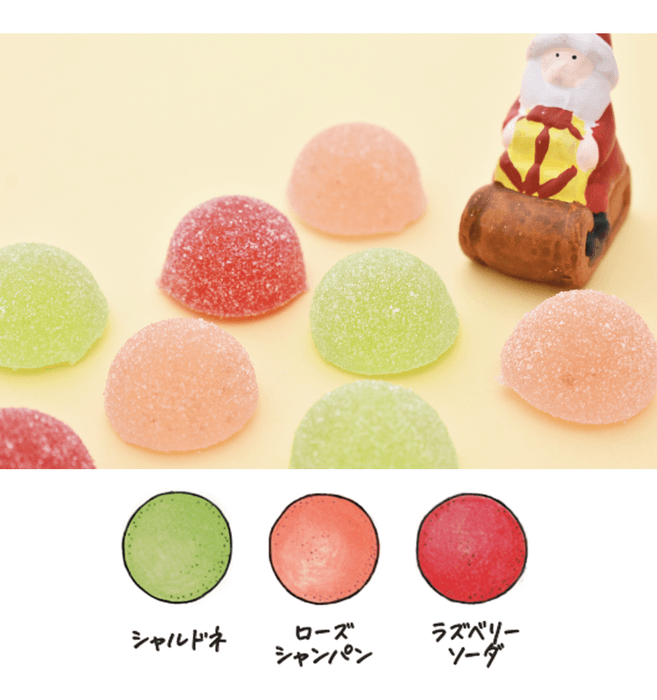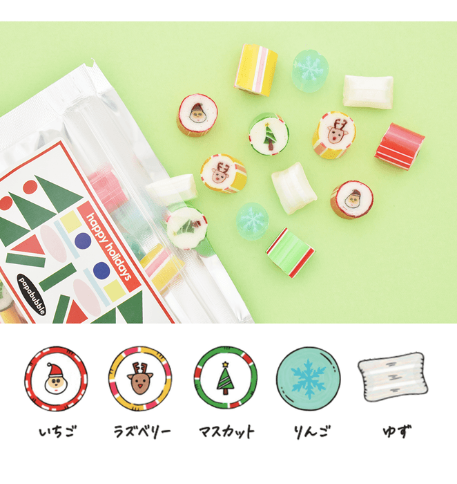 1つ目はクリスマスの定番を集めた「サンタミックス」。サンタさんやトナカイ、光にかざすと輝いて見えるクリスマスツリーなど、誰もが楽しめる絵柄とフレーバーで作りました。