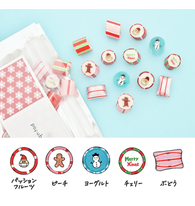 「サンタミックス」「スノーマンミックス」「バブレッツ(ゼリーグミ)」が2個ずつ入っています(フレーバーはランダムです)。