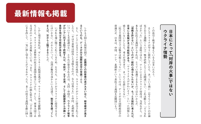 国際関係が目まぐるしく動いているなかでの執筆となった。 なるべく最新の情報を盛り込むべく、校了のギリギリまで原稿に手を入れたが、 校了から刊行までには多少、時間がかかる。 おそらく、その間にさらに事態は動いているだろう。 本書で追いきれなかった点はご容赦いただきつつ、 ぜひとも自分で考えてみてほしい。 井の中の蛙を脱し、真にグローバルな視点から、 まっすぐに、鋭く、今、自分が生きている世界のありようをとらえる。 本書が、そのきっかけとなれば幸いである。