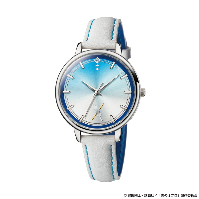 髪色を思わせる白の本革バンド。ステッチと裏地は瞳の色をイメージした青。