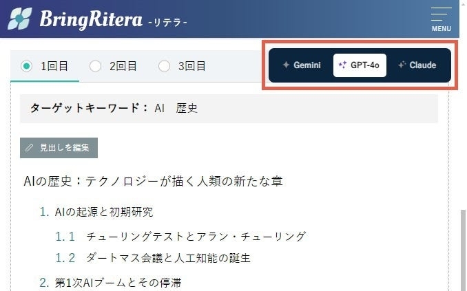 ChatGPT、Gemini、Claudeの各最新モデルを切替えながら利用可能!SEOに強いAIライティングツール「BringRitera(リテラ)」
