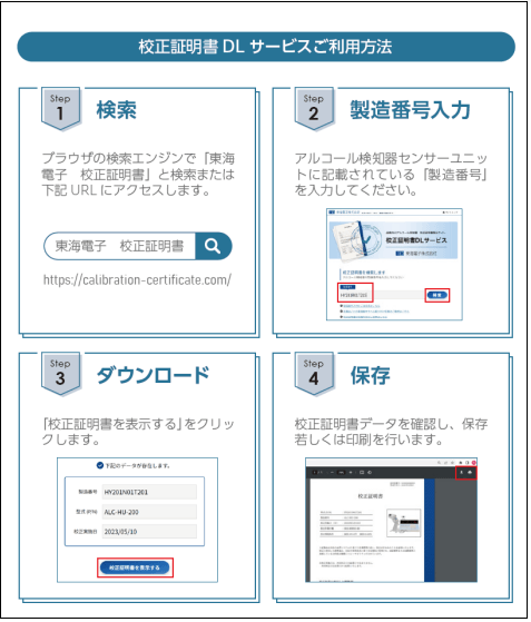 アルコール検知器の製造番号を入力いただくことで、直ちに校正証明書の電子データをダウンロード・印刷することが可能になりました。