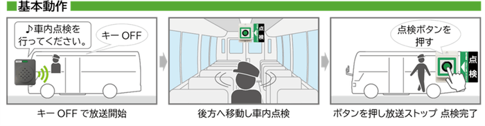 『かくにん君』は車両キーOFFに連動し、車内点検を促すアナウンスが流れ、「点検ボタン」が押されるまで繰り返し流れ続けます。点検ボタンを車両後部に設置することで、点検者が必然的に後部座席まで確実に点検を行えるようになり、置き去り事故を防止します。また、有線式のため電池切れ等の心配がなく、確実な動作を実現しました。