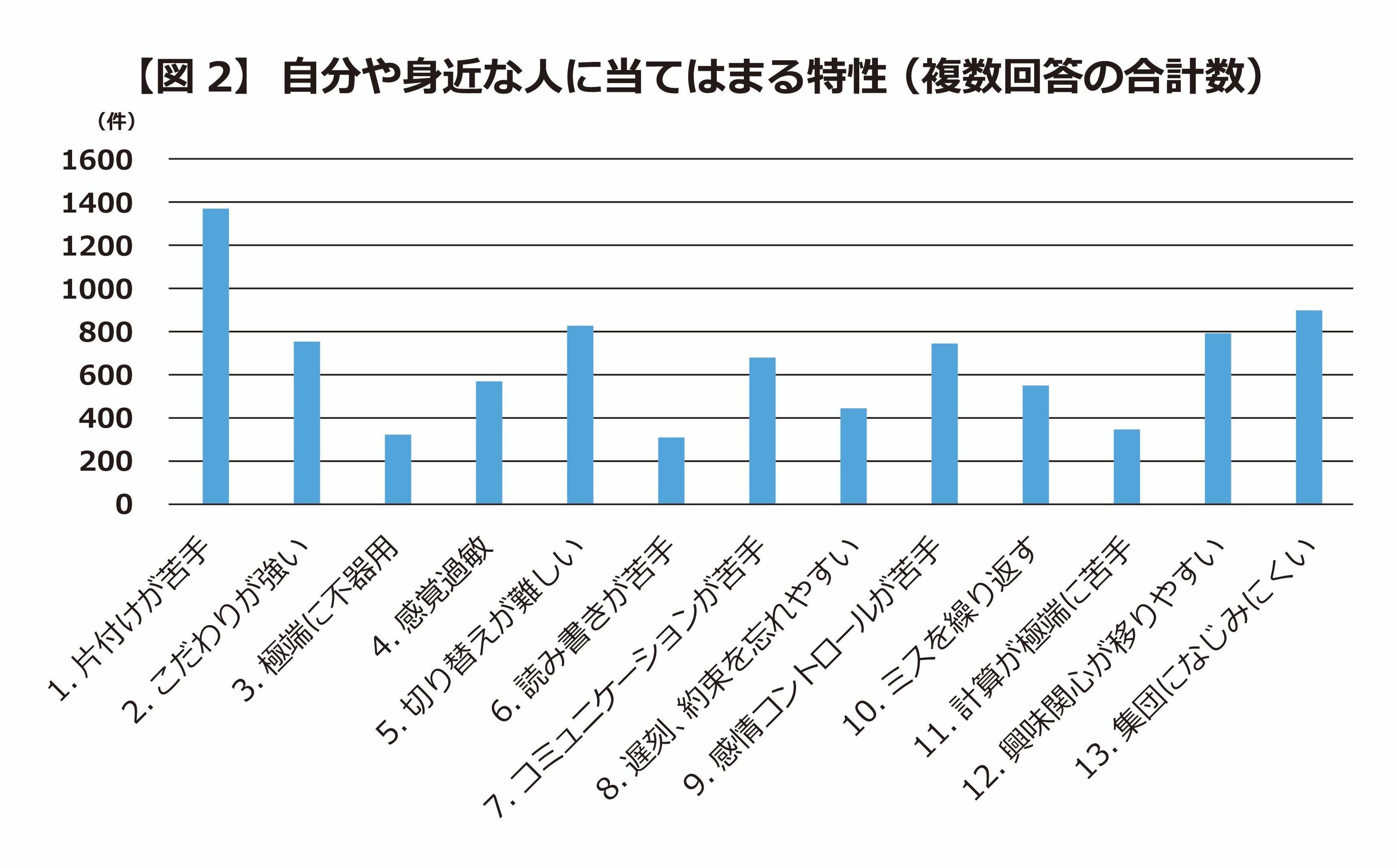 その結果、「1.片付けが苦手」「13.集団になじみにくい」「7.コミュニケーションが苦手」「2.こだわりが強い」「9.感情コントロールが苦手」「5.没頭すると切り替えが難しい」「12.興味関心が移り替わりやすい」は、発達障がいの有無に関わらず「自分や身近な人(家族・知人)に当てはまる」という回答が多い。(図2)