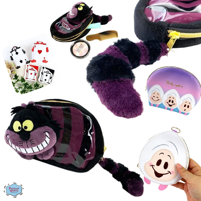 不思議の国のアリスの中でも人気のキャラクター・チェシャ猫ポーチをお届けします。さらに、ベビーオイスターやトランプ兵などのレアキャラグッズもご紹介。実用性のある折りたたみポーチは必見です。