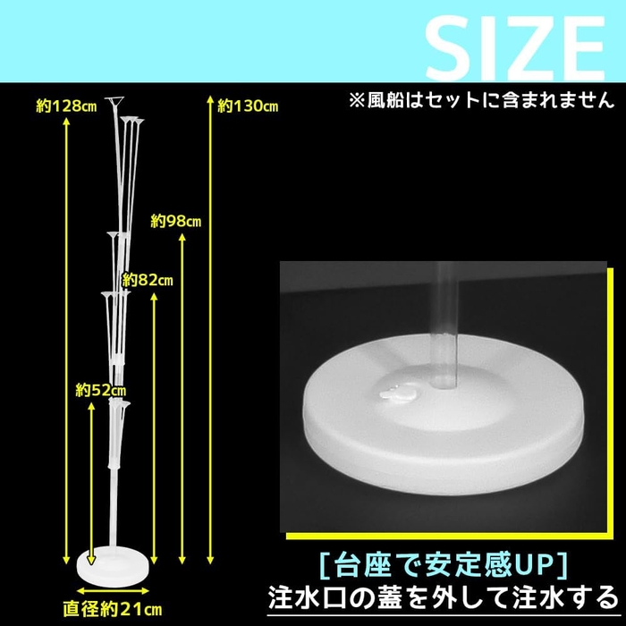 水を入れて重しにできる台座が付いており、人が通過した際の振動や風が吹いても倒れにくい安定感があるので設置場所を問いません。屋外のパーティーや撮影スポットとしても使いやすいです。組み立てに難しい工程や工具は一切使用不要!風船を膨らませたらスティック先端にある留め具に風船を括りつけるだけなので、短時間でデコレーションが完成します。