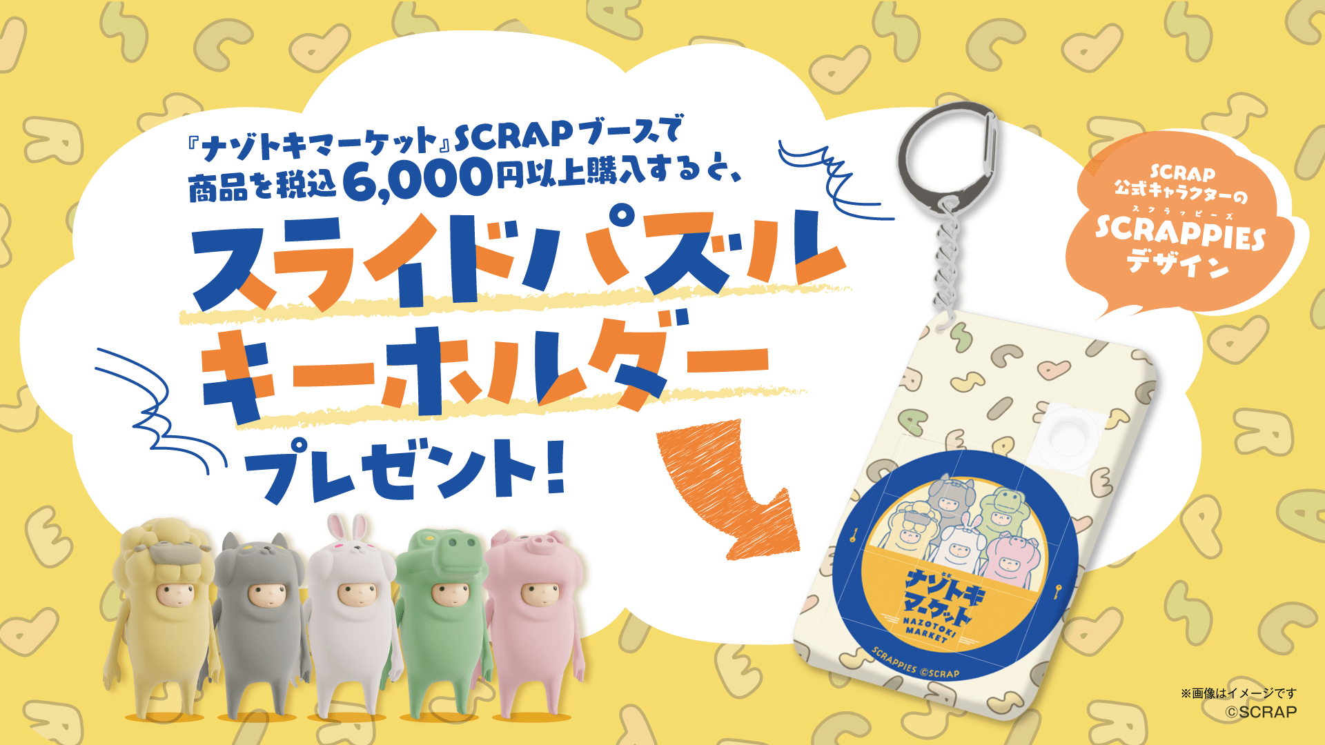 一会計につき税込6,000円以上購入した方へ、SCRAP公式キャラクターであるSCRAPPIES(スクラッピーズ)がデザインされたスライドパズルキーホルダーをプレゼント。