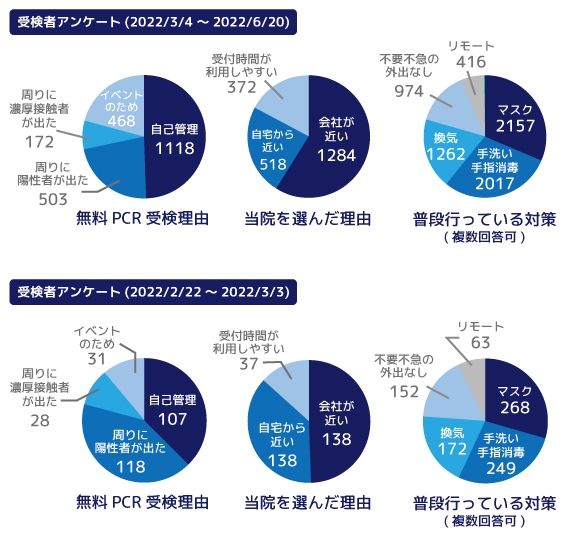 市谷八幡クリニックで無償PCR検査を受けた方のアンケートによると、受検理由の設問に対して、前回(2022年2月22日〜3月3日)は「身近に濃厚接触者や陽性者が出たため」という回答割合が多かったが、今回のアンケート(2022年3月4日〜6月20日)では、「自己管理のため」という回答の割合が多く、無料PCR検査が認知され自己管理のための安心材料となっている様子が伺えます。