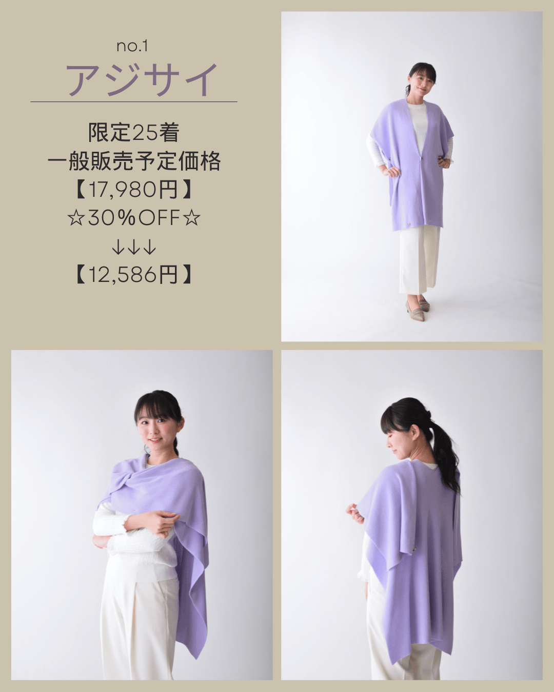 この『ぬくもり纏うアレンジストール』は、4つのカラーバリエーションからお好みの1着を選べ、ストールを少し長めにデザインされたベストとしても包み込むような温かさで工夫を凝らし、高齢者の方々が明るく前向きな気持ちで過ごせるような、ワクワクお出掛けしたくなるような、そんな商品の開発を目指しました。