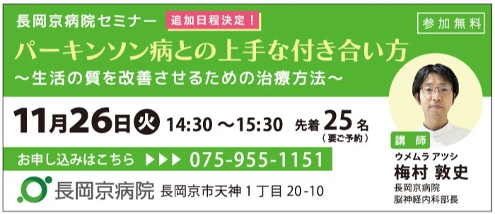 【大好評につき、追加日程が決定!】 長岡京病院、パーキンソン病に関するセミナーを11月26日(火)に開催!パーキンソン病との上手な付き合い方 ~生活の質を改善させるための治療方法~
