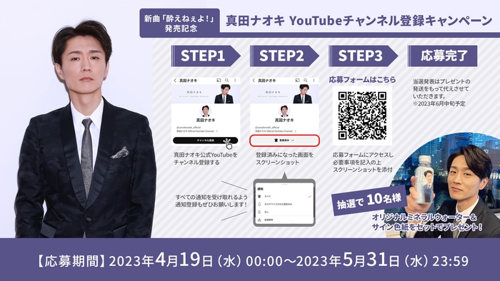 また、新曲の発売にあわせて、『真田ナオキ YouTubeチャンネル』を開設。1本目の動画として、「酔えねぇよ!」ミュージックビデオのメイキング映像と、自身のコメント動画が公開された。現在、チャンネル登録キャンペーンを開催中で、キャンペーン期間は、5月31日まで。このチャンネルでは今後もオリジナルコンテンツが公開されていく。