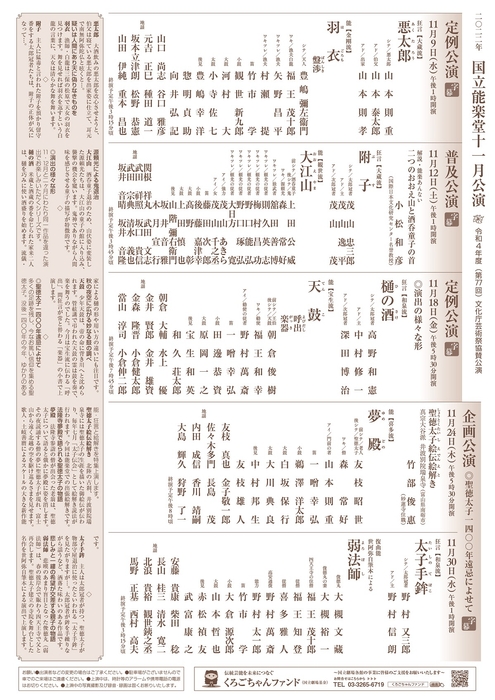国立能楽堂(東京都渋谷区千駄ヶ谷4-18-1)の11月主催公演が下記の通り上演されます。