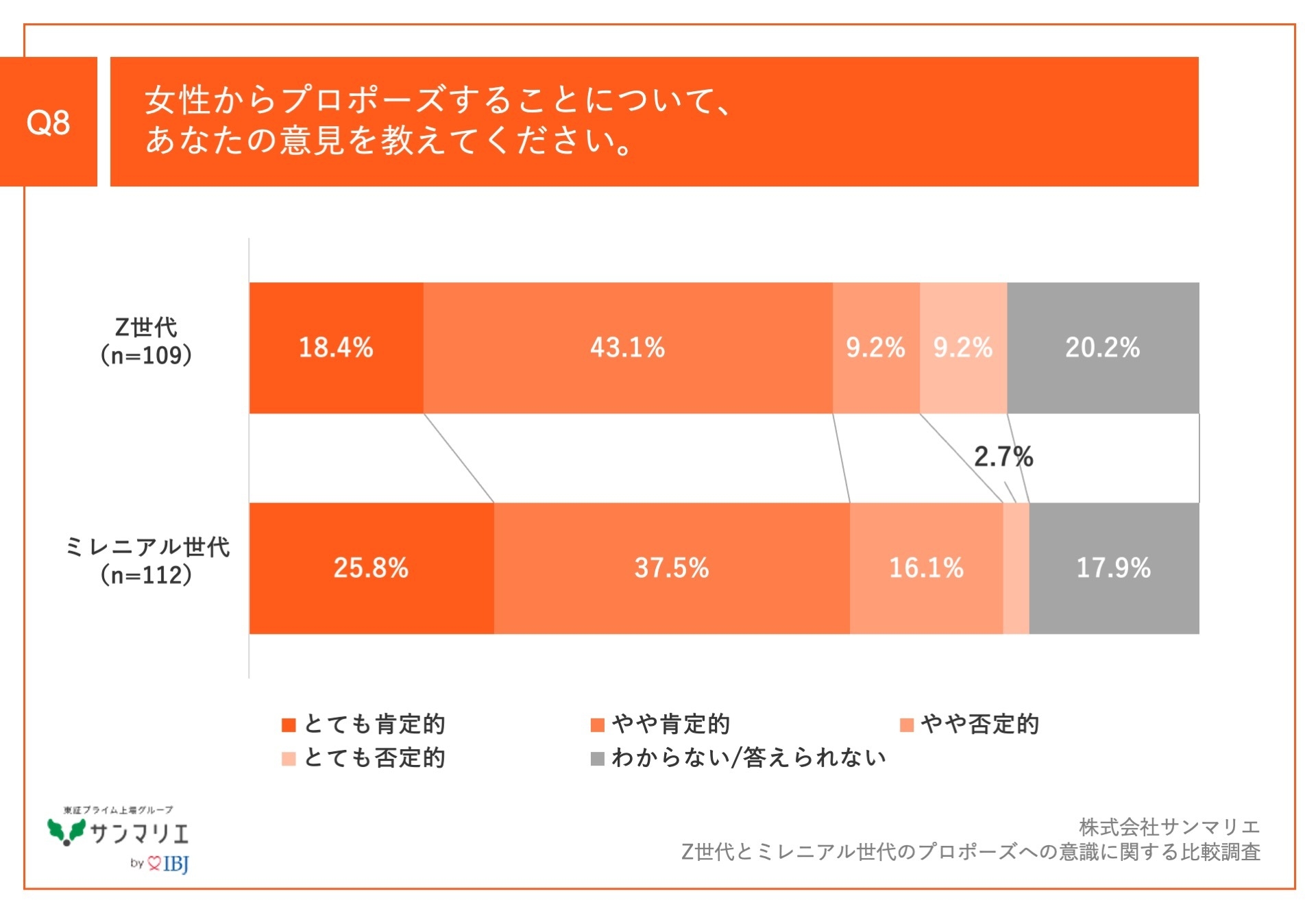 「Q8.女性からプロポーズすることについて、あなたの意見を教えてください。」と質問したところ、Z世代(n=109)は「とても肯定的」が18.4%、「やや肯定的」が43.1%、ミレ二アル世代(n=112)は「とても肯定的」が25.8%、「やや肯定的」が37.5%という回答となりました。