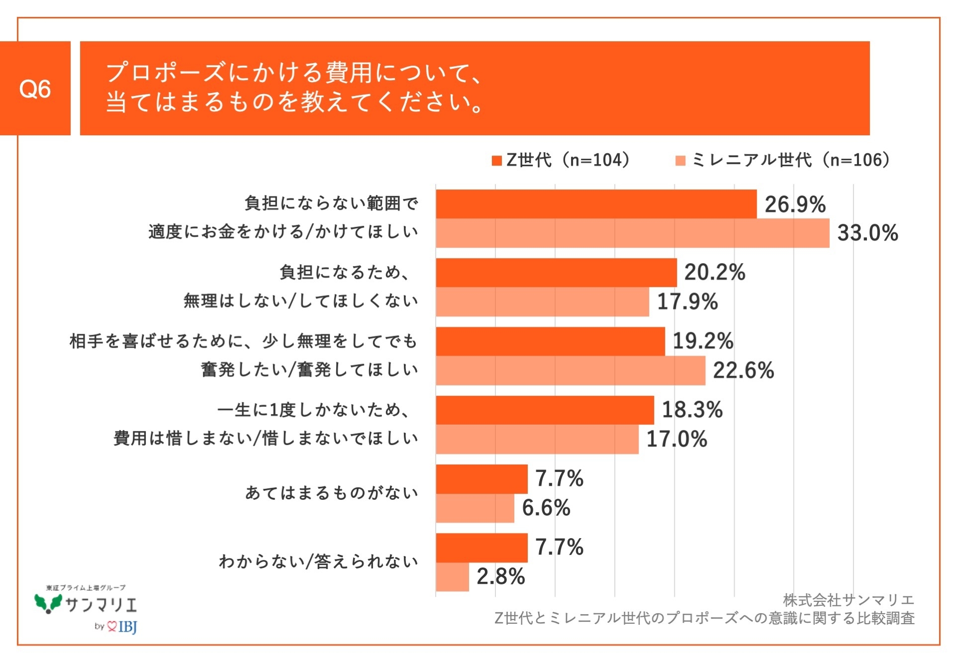 Q5で「プロポーズはいらない」「わからない/答えられない」以外を回答した方に、「Q6.プロポーズにかける費用について、当てはまるものを教えてください。」と質問したところ、Z世代(n=104)は「負担にならない範囲で適度にお金をかける/かけてほしい」が26.9%、「負担になるため、無理はしない/してほしくない」が20.2%、ミレ二アル世代(n=106)は「負担にならない範囲で適度にお金をかける/かけてほしい」が33.0%、「相手を喜ばせるために、少し無理をしてでも奮発したい/奮発してほしい」が22.6%という回答となりました。
