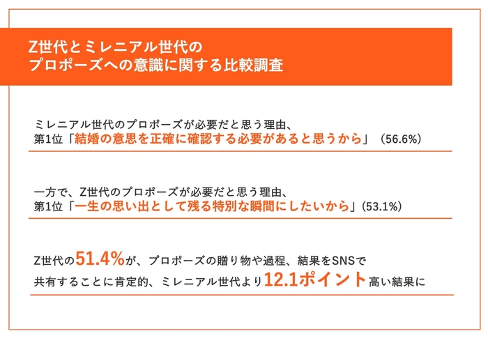 ■Z世代からは「一生の記念に残るようなプロポーズ」や「タイミング」、ミレ二アル世代からは「本気度」や「しっかりと意思確認すること」などを重視する声も