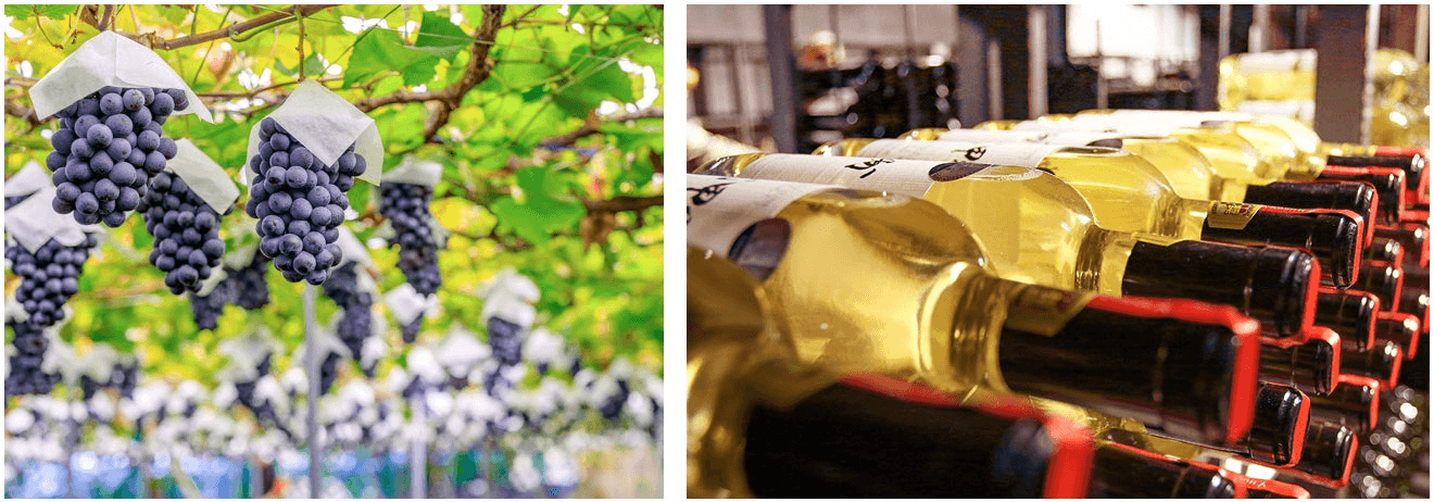 左:低温発酵で醸造。甘さと酸味が調和し、もぎたての葡萄を頬張ったようなフレッシュでフルーティーな甘口ワイン「デラウェア甘口’22」(ルバイヤート)には、「ブルーチーズとドライフルーツの最中」を合わせて。