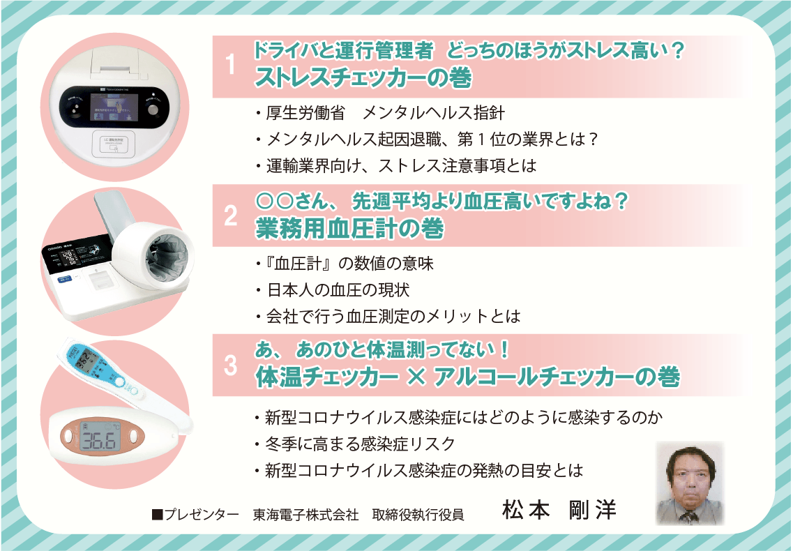 点呼機器およびアルコール検知器を開発・販売する東海電子株式会社(本社:静岡県富士市 代表:杉本 哲也)は、この度、「乗務員の安全・健康を守る新しい3つの健康管理機器」無料オンラインセミナーを開催いたします。